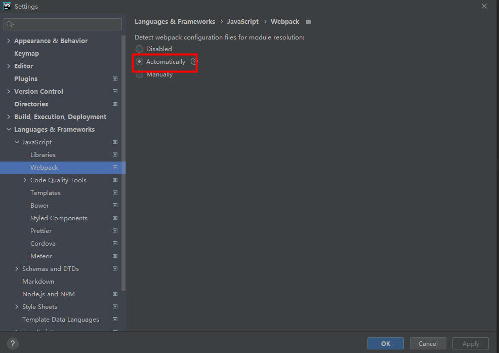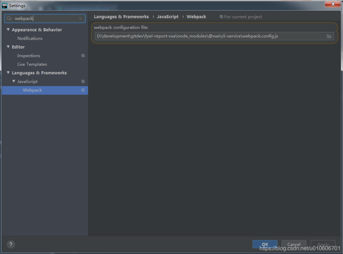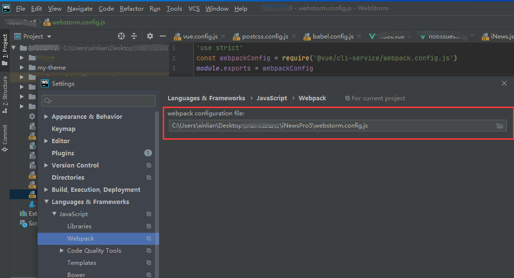 3、webstorm 设置里找到以下位置,引入新建的 webstorm.config.js 即可, 不生效把webstorm重启一下