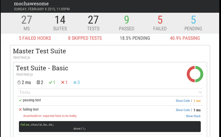 上面的运行结果表示,测试脚本通过了测试,一共只有 1 个测试用例,耗时是 8 毫秒。