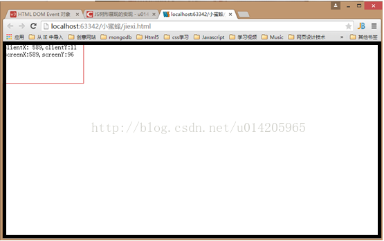 下图可以看到当鼠标移动事件 onmousemove 发生的时候,在 id 为 div 的里面显示 clientX,clientY,screenX,screenY, 的值;