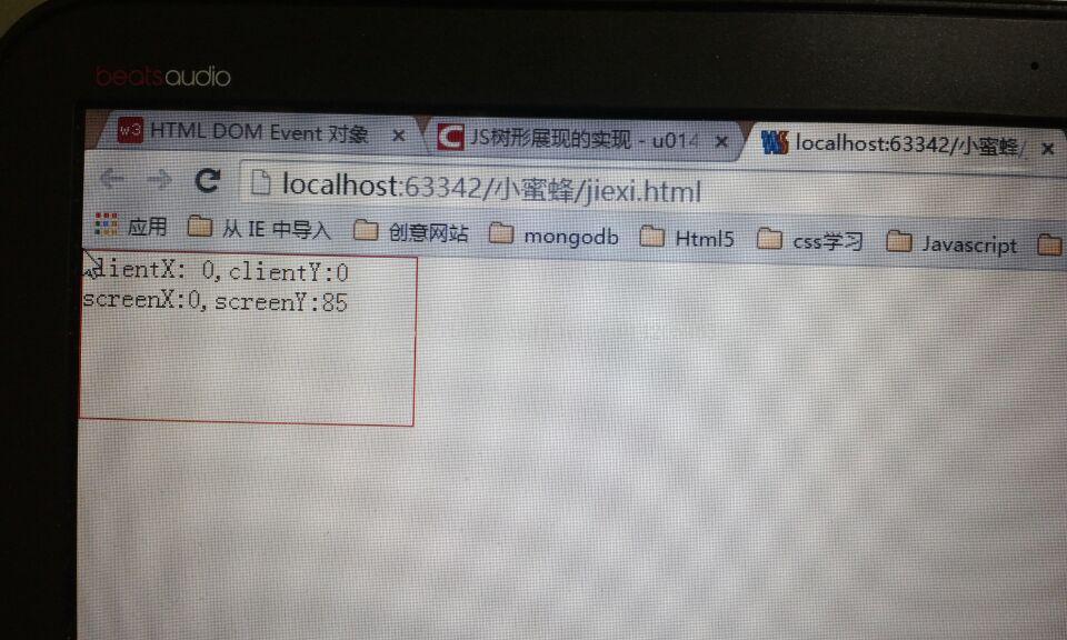 而 screenX 为 0,screenY 为 85,因为鼠标在 “浏览器有效区域” 里的 x 坐标就是 0,y 坐标也是 0,而鼠标在 “显示器屏幕区域” 的 x 坐标是 0,y 坐标是 85px
