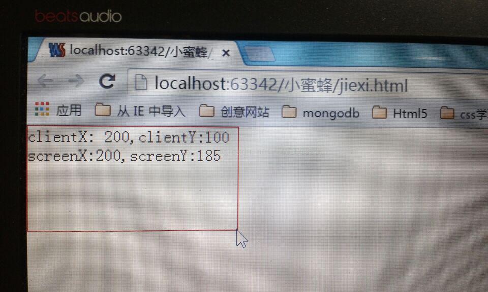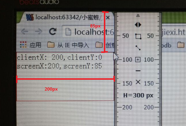 上图中我的鼠标在浏览器有效区域里 的 x 坐标是 200px,y 坐标是 0;而 screenX,screenY 则是相对以整个显示屏幕区域而言的。