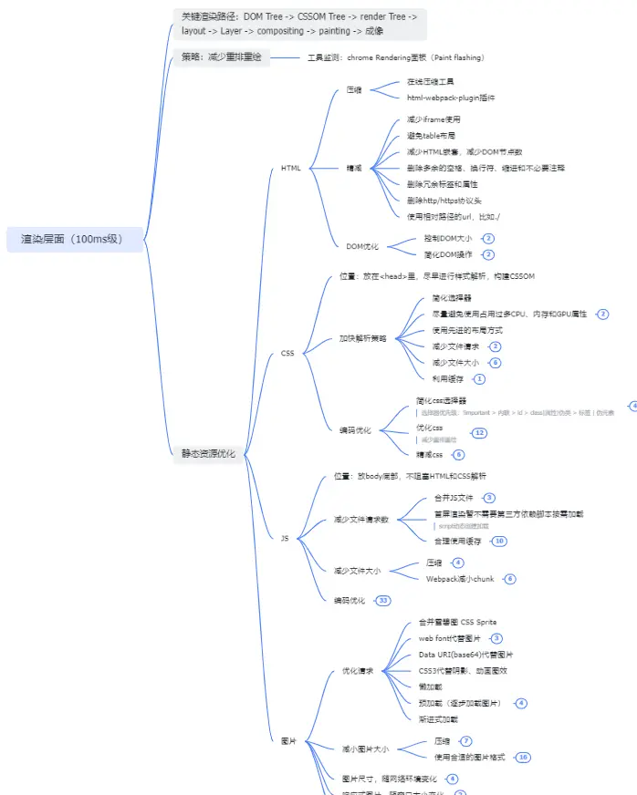 我们了解 “页面渲染关键环节” 后,便可知晓影响页面渲染性能的因素主要是静态资源:HTML、CSS、JS、图片等。因此 “渲染层面” 的性能优化方案主要就是围绕静态资源展开探索,其方案制定可围绕下面 2 个原则展开: